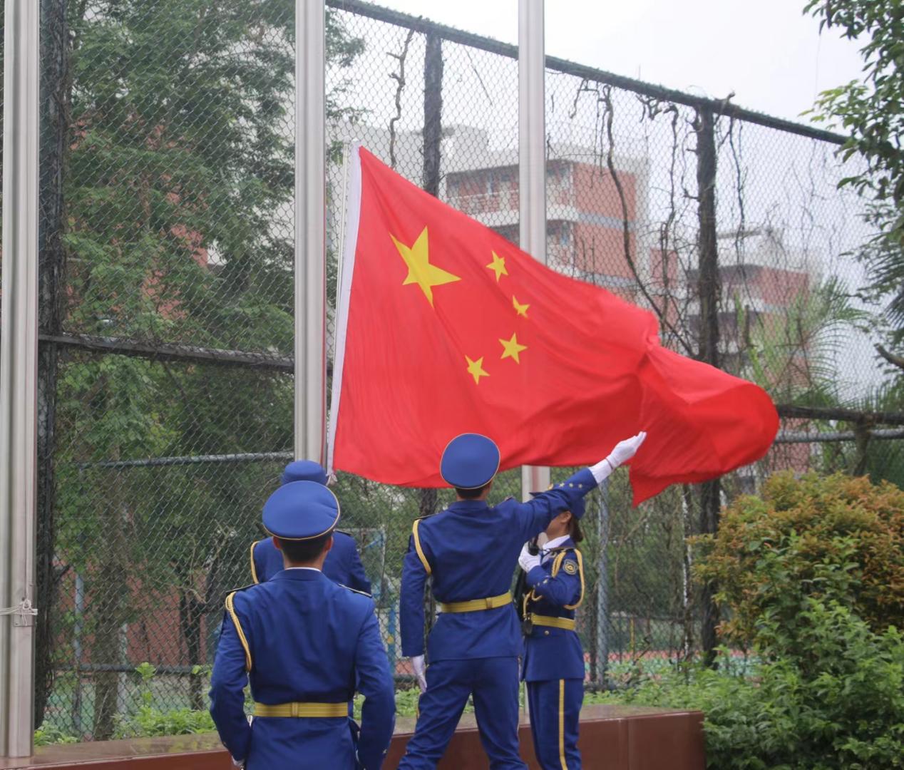 七点四十五分,升国旗仪式正式开始。国旗仪仗队的同学们迈着整齐划一、铿锵有力的步伐,护送着五星红旗正步走向旗杆。宏伟的国歌奏响,五星红旗冉冉升起,全体师生庄严肃立,行注目礼,高声共唱国歌,歌声整齐嘹亮。