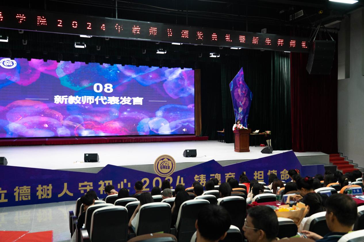 在热烈的掌声中,典礼正式开始。首先,经贸学院党总支书记李繁发表了热情洋溢的致辞。他代表学院向全体教职工表示了衷心的感谢和崇高的敬意,并对新生们的到来表示热烈的欢迎。李繁强调,教育是国家发展的基石,教师是教育事业的中坚力量。他回顾了过去一年学院在教育教学、科研创新等方面取得的显著成绩,并希望全体教师能够继续发扬教育家精神,坚守教育初心,勇担育人使命,为建设教育强国贡献自己的智慧和力量。