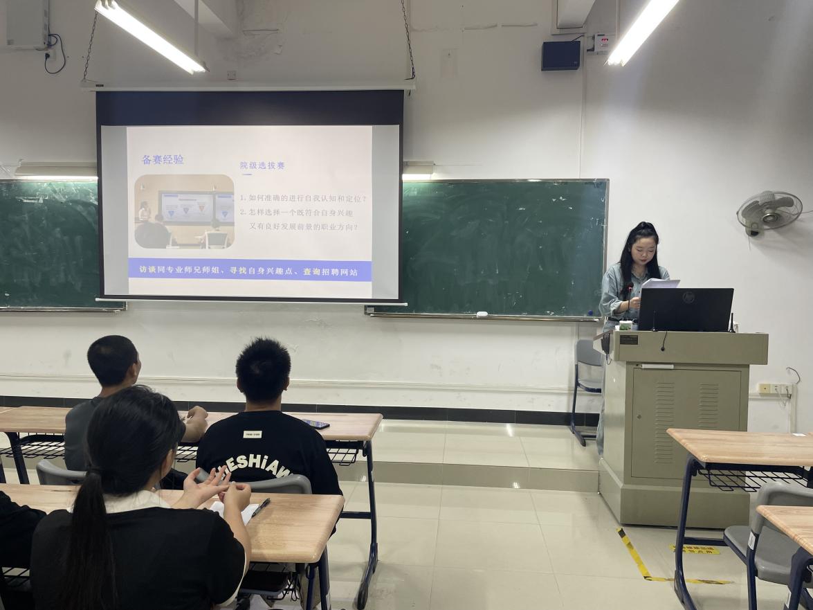 活动中,刘涵宇先对大学生职业规划大赛进行了全面深入的概述,强调其不仅是比赛,更是大学生深入了解自己、探索职业世界的重要平台,参赛可以帮助学生梳理兴趣、优势和价值观以明确职业方向。同时她还详细介绍了初赛规划书撰写、复赛现场展示及决赛综合答辩等环节的比赛流程,指出各环节参赛选手需具备优秀的专业素养、创新思维和实践能力。随后,她分享了自己的备赛经验,她认为在比赛中脱颖而出的关键因素包括独特规划视角、扎实专业知识、出色沟通表达能力和良好团队协作精神等,并以自身丰富参赛经验为例,生动讲述如何展现自身优势及应对挑战困难,让大学生们对职规赛有了更直观深刻的认识。