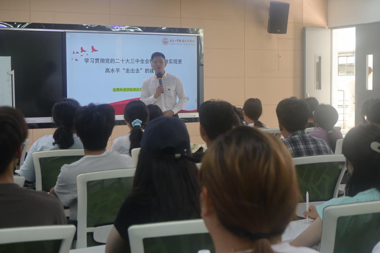 为深入学习贯彻党的二十届三中全会精神,了解全党和全国人民的重要任务和中心工作,提升应用外语学院学子对国家发展道路的认知,培育出新时代外语专业人才。10月31日,应用外语学院党总支书记罗春科在行知楼604面向2024级新生讲授“思政第一课”。罗春科以“学习贯彻党的二十届三中全会精神,争做新时代有为青年”为主题,带领外语学子深入解读了党的二十届三中全会精神,激励外语学子积极投身中国式现代化建设的火热实践,充分展现当代青年担当。