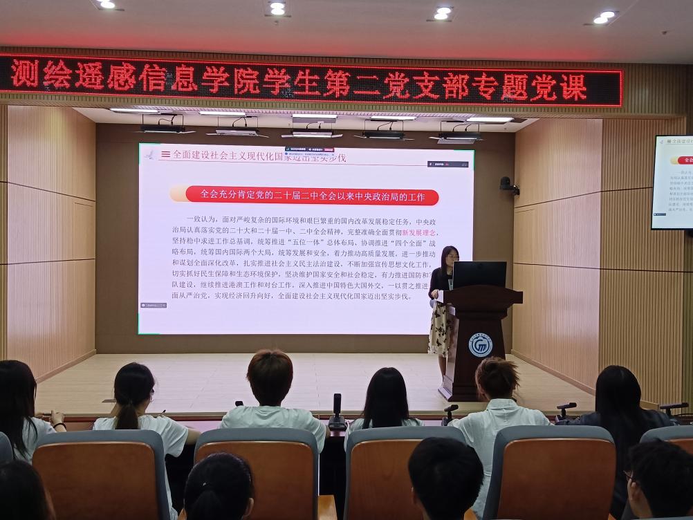 为进一步学习贯彻党的二十届三中全会精神,引导学生党员学思践悟,11月17日晚,测绘遥感信息学院学生第二党支部在博学楼测绘学术报告厅开展了题为“在全面深化改革新征程中彰显青春力量”的党的二十届三中全会精神宣讲活动。宣讲活动以专题党课的形式开展,由专职组织员、支部书记冯臻佳主讲。支部学生党员、发展对象共计34人参加,其中在校外实习的学生党员通过腾讯会议在线上同步参加。