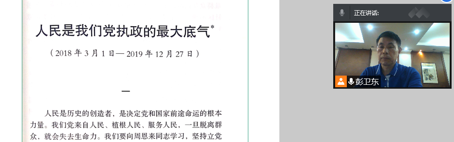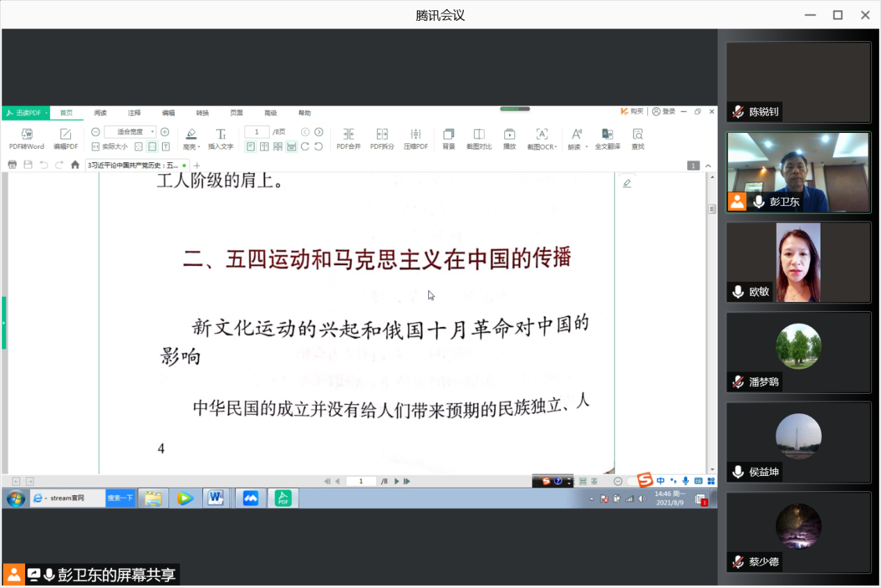 7月20日下午,党总支通过腾讯会议开展第一次党史学习教育专题学习,内容包括《习近平谈治国理政:人民是我们党执政的最大底气》、《习近平同志在庆祝中国共产党成立100周年大会上的重要讲话》、《中国共产党简史:五四运动和马克思主义在中国的传播》、《毛泽东邓小平江泽民胡锦涛关于中国共产党历史论述摘编:邓小平重要论述》,分别由党总支书记彭卫东、组织委员侯益坤、副书记欧敏和宣传委员陈锐钊带领学习。