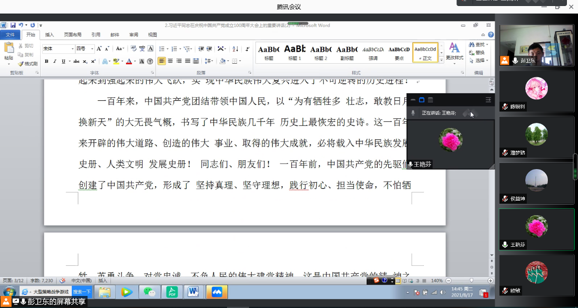 王艳芬分享学习《习近平同志在庆祝中国共产党成立100周年大会上的重要讲话》