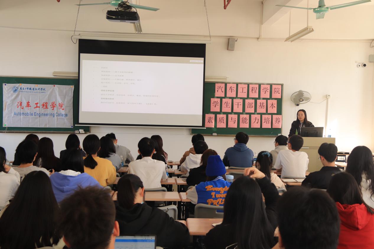 青年学生作为国家和民族的未来和希望,既要有信仰和理想领航,又要有本领和意志支撑。学生干部作为青年学生中的佼佼者,更应提高自身政治素养和工作能力,进一步发挥学生干部的先锋模范作用。为此,汽车工程学院2021年“青年马克思主义者培养工程暨学生干部基本素质与能力培养”培训班,第一期第二课于2021年11月11日在白云校区明德楼2-704召开,此次培训内容为“新闻报道撰写能力基础班”专题。