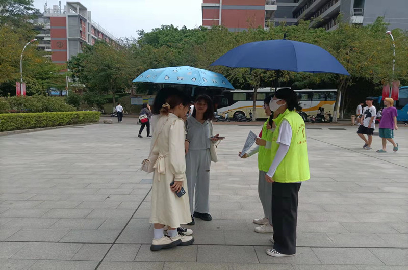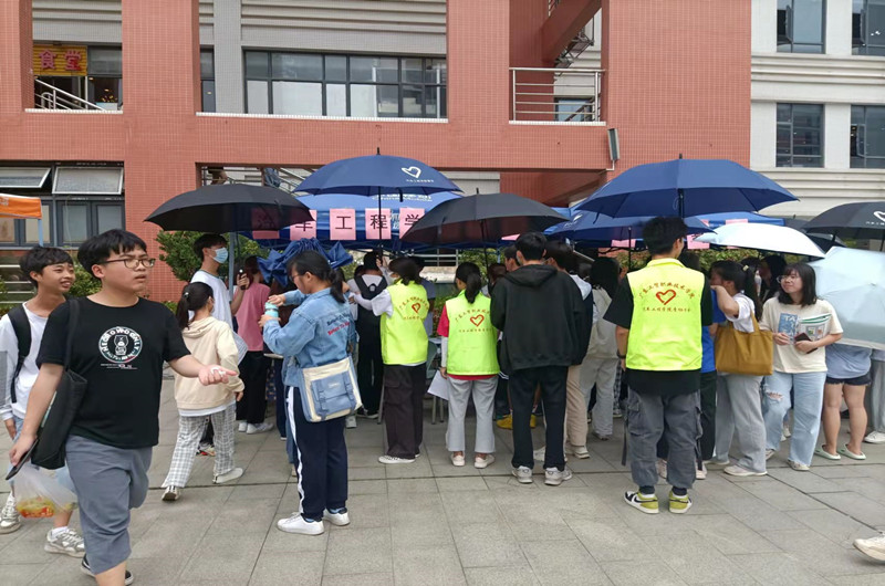 活动前期,志愿者提前将雨伞整理好并做好标记,分别投放在明德楼和行知楼出口处,以及2栋、5栋、8栋、11栋、14栋等部分学生宿舍楼出口处,并且根据各放置点的实际情况,合理地放置“爱心伞”,使得活动顺利进行。为了让更多的师生了解“爱心伞”活动,活动启动当天,志愿者们在摊位附近积极宣传,向过往的师生介绍爱心伞活动,同时倡导大家诚信借伞。