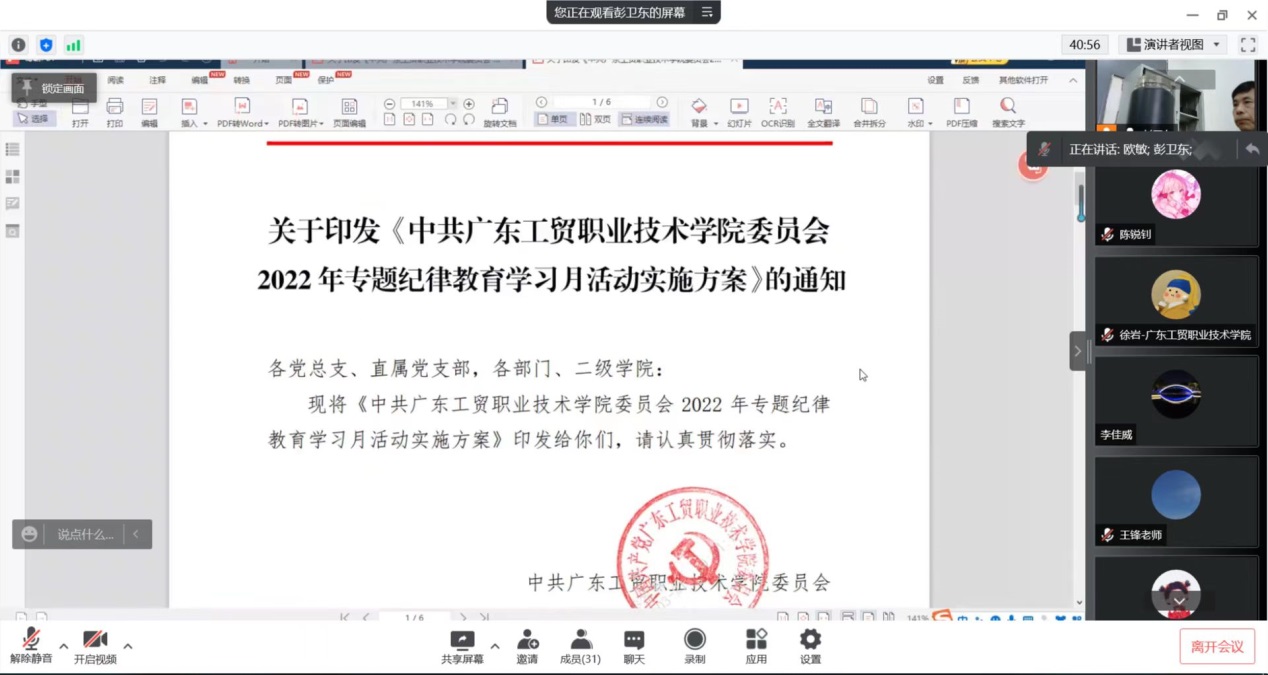 会上,党总支副书记欧敏带领全体教职工共同学习了《关于印发<中共诸侯快讯ok1122登录入口委员会2022年专题纪律教育学习月活动实施方案>的通知》(粤工贸院党字〔2022〕14号)文件精神,指出本次活动以“守纪律强作风,促整改提实效”为主题,以党员领导干部为重点,面向全体党员干部开展教育,强调教师要自觉遵守学校的各项规章制度,强化党章党规党纪意识,锤炼实干担当廉洁政治品格,以实际行动推进巡察整改任务高质量完成,为学校持续健康稳定发展提供坚强纪律保障。