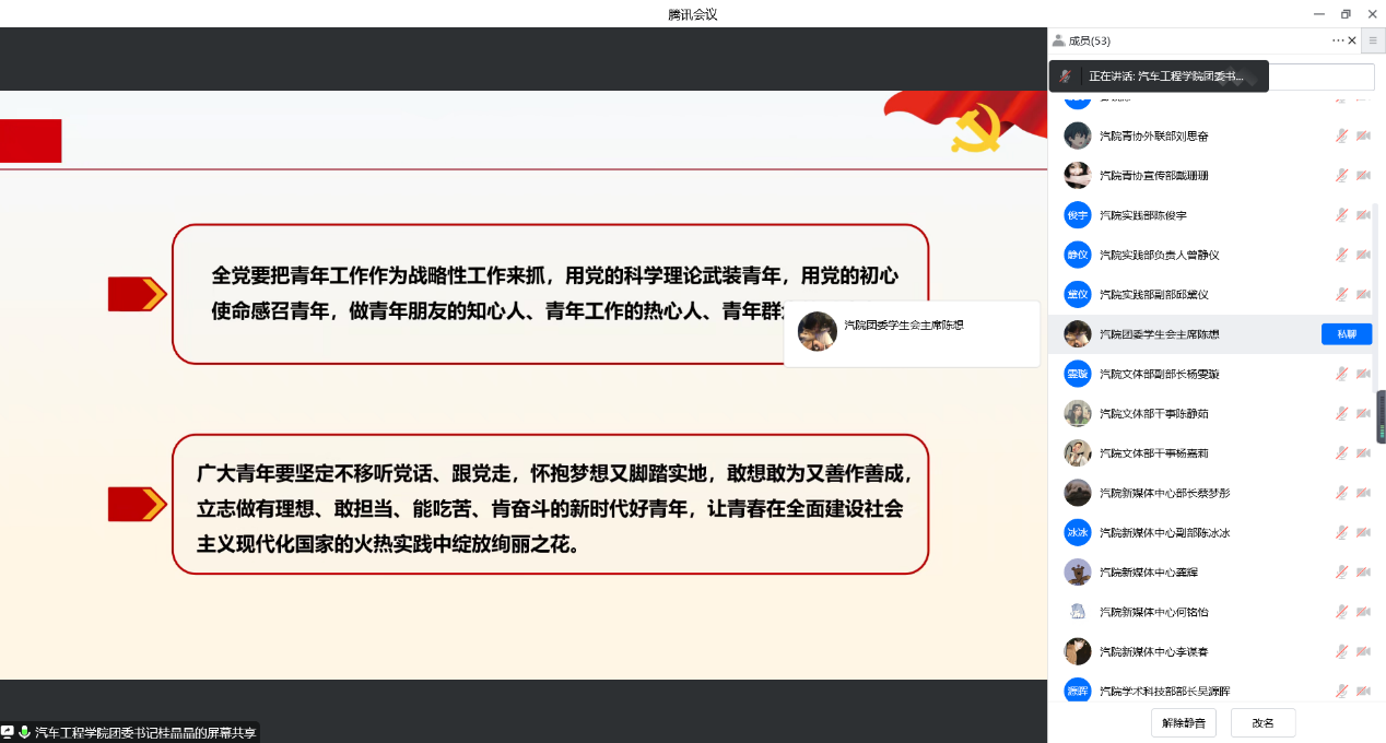 恢弘蓝图展画卷,伟大征程凝人心。为深入学习贯彻党的二十大精神,引导青年学子立志做有理想、敢担当、能吃苦、肯奋斗的新时代好青年。校宣讲团成员、汽车工程学院团委负责人桂晶晶于12月13日下午开展“踔厉奋发向未来,勇毅前行谱新篇”为主题的党的二十大精神宣讲;本次宣讲活动也是团委书记上团课的内容之一。汽车工程学院团委、学生会所有干部干事参与宣讲学习,本次宣讲会采取线上会议方式进行。