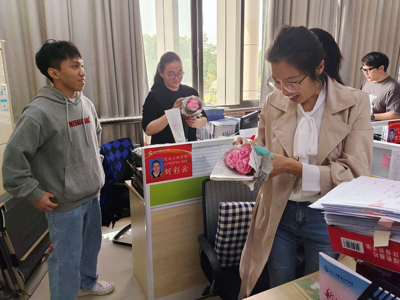 给老师们送花过程 一束花,一份祝福,不仅缓解了繁忙的工作压力,更营造了和谐温暖的学院氛围,使每一位女老师充分感受到了节日带给她们的喜悦和快乐。利用这样特殊的节日为老师送去祝福,表达学生们对老师的感恩情怀。 (图/汽车工程学院学生党支部 文/温雅麟 编辑/刘彩云、林诺怡 审核/彭卫东) |