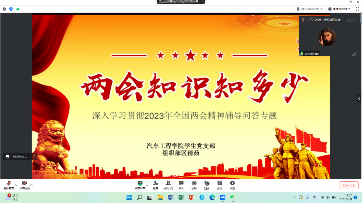 为深入学习党的二十大精神,7月31日晚,汽车工程学院学生党支部开展以“学习两会知识”为主题的暑假专题交流会。此次会议由支部党员孙泽淇主持,我院学生党支部书记刘彩云及支部全体党员参加本次专题交流会。