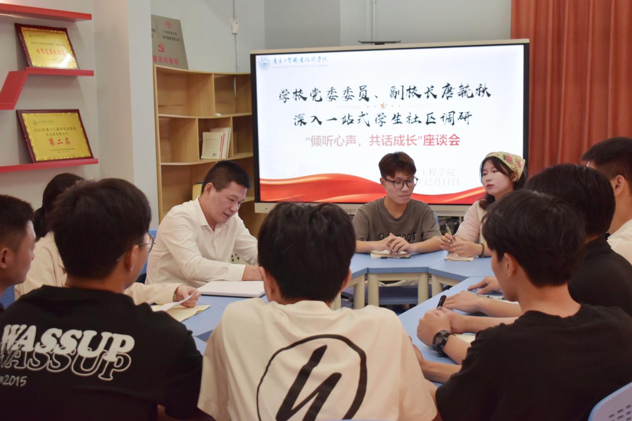 “青年兴则国家兴,青年强则国家强”,青年是祖国的未来、也是民族的希望,为推进学校“一站式”学生社区综合管理模式建设走深走实,更好地关心关爱青年、教育引导青年、激励激发青年、汇聚广大青年的磅礴力量,2023年12月11日,汽车工程学院在白云校区16栋6楼辅导员工作室开展以“倾听心声,共话成长”为主题的“一站式”学生社区调研座谈会。学校党委委员、副校长唐毓秋,汽车工程学院辅导员黎汉清以及汽车工程学院三个年级的学生干部代表出席本次座谈会。本次座谈会由黎汉清主持。