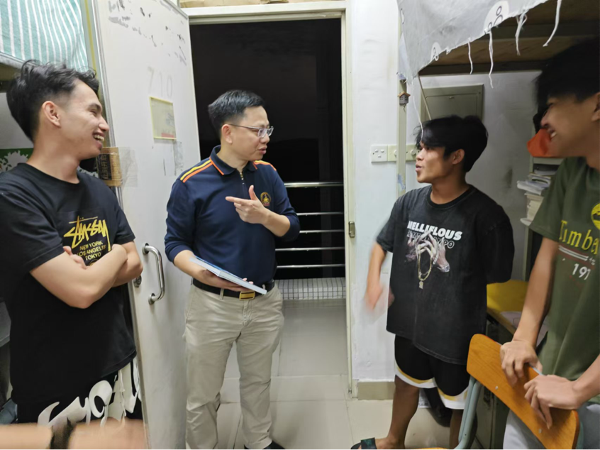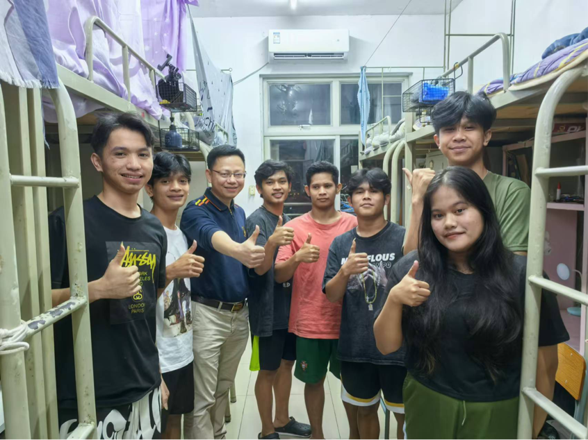 伍部长利用值班时间走访22机制国际班留学生宿舍,详细了解他们的生活学习情况和实际需求,勉励学生要刻苦学习,合理规划,充分利用在华留学的机会,加强对汉语和中国文化的学习。同时和留学生们一起欢唱印尼民歌,讨论美食,现场氛围其乐融融。