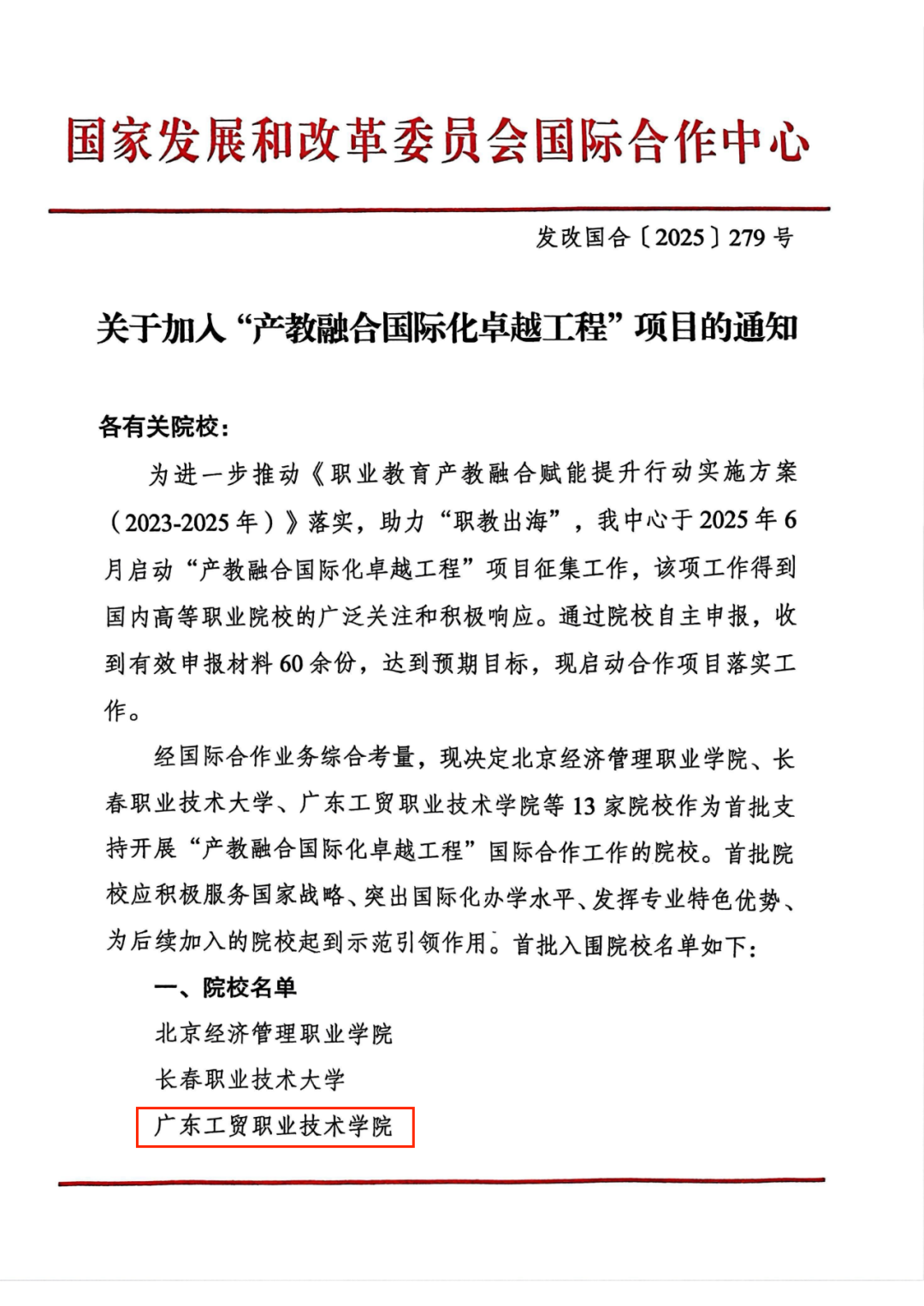 为贯彻落实《职业教育产教融合赋能提升行动实施方案(2023—2025年)》,推动“职教出海”,经国家发展改革委国际合作中心严格遴选60余份申报材料,全国共13所院校入选首批建设单位。