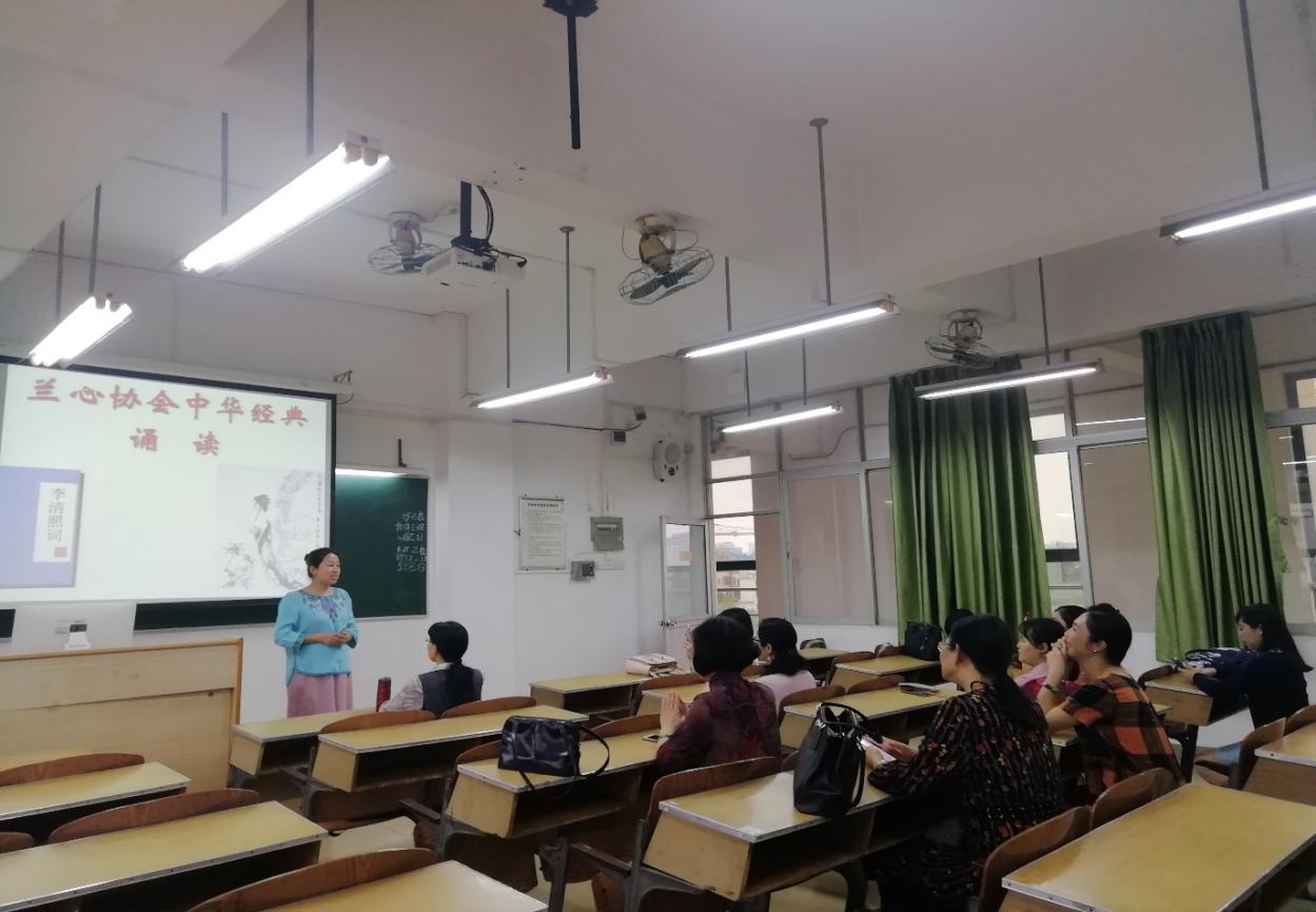 结合学校关于开展《“庆中华人民共和国成立七十周年逐青春韶华梦想”系列主题活动之“诵国之经典展时代新华”中华朗诵会》的通知精神,2019年5月10日下午,兰心协会全体会员齐聚在天河校区西区综合楼501教室,聆听着悠扬的音乐,一起走进古诗词的浩瀚世界,大家一起感受诗的情怀,领悟词句的精妙之处。邓彩云老师给大家讲解了李清照两首《如梦令》的词,带领大家一起诵读李商隐的古诗《夜雨寄北》;李文婷、邱秀芳、黄妍、徐萌四位老师根据自己对文学作品的理解和感悟,以不同的风格演绎着篇篇美文,黄妍老师别具特色的粤语古词吟唱,更是把活动气氛推向了高潮。