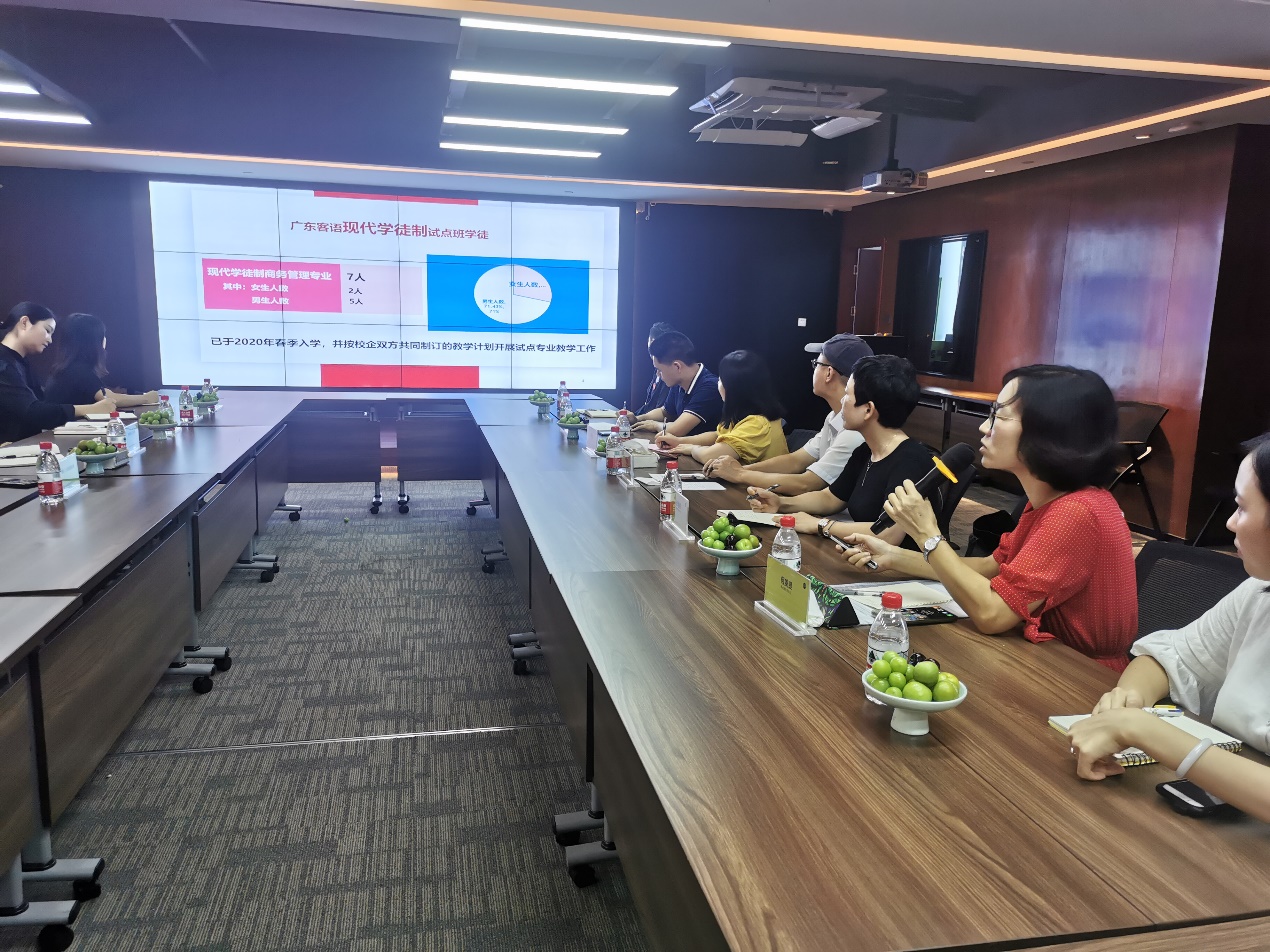 7月2日,工商管理学院第二批现代学徒制试点商务管理专业团队在广东客语餐饮有限公司召开客语学徒制阶段性总结暨教学研讨会。学院党总支书记周清莲、院长邹德军、副书记谢宏祥、副院长倪春丽、商业服务系主任何美贤、办公室主任王家祺,广东客语总经理陈景新、副总经理曾开源、人资总监王燎原、营运助理兼教学秘书陈秋洁等参加了此次会议。