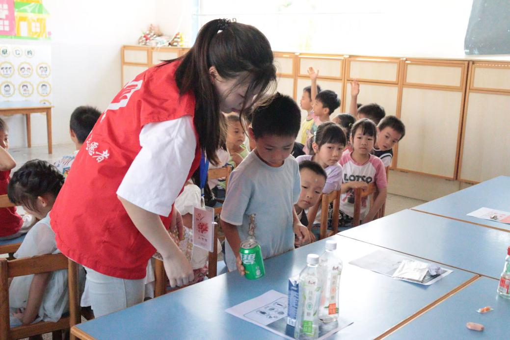 接着,志愿者们将四种印着不同颜色垃圾桶的卡片放置在桌子上,随机在过期药品、牛奶纸盒、废弃电池、苹果核等垃圾模型中选择一种让小朋友们进行垃圾分类,并对分类正确的小朋友进行奖励。教室内欢声笑语,时不时传出阵阵掌声,志愿者与小朋友们共学,不仅传授了知识,更在无形中增强了自己的环保意识。