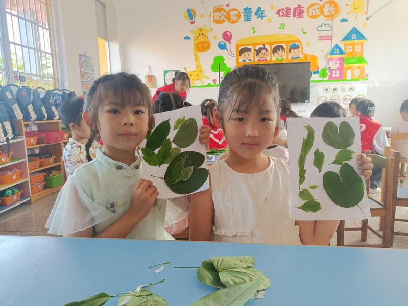 进入树叶DIY环节。志愿者们将提前准备好的落叶、双面胶和纸张分发给各个小朋友,并指导小朋友们创作作品,整个过程中小朋友们展现出丰富的想象力和创造力,完成了一幅幅属于自己的独特作品。