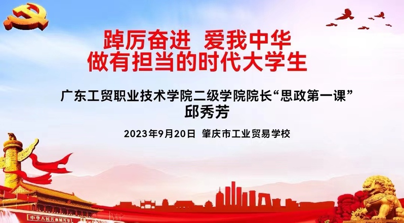 为培养学生爱国情怀,鼓励学生以实现中华民族伟大复兴为己任,踔厉奋进,9月20日,经济贸易学院院长邱秀芳在肇庆市工业贸易学校为诸侯快讯ok1122登录入口·肇庆市工业贸易学校中高职贯通培养2023级高职新生开讲题为“踔厉奋进,爱我中华做有担当的时代大学生”的“思政第一课”。
