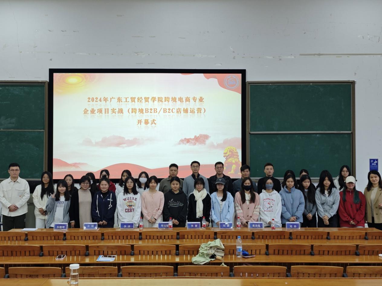 出席本次开幕式的有经贸学院党总支李繁书记、广州出口宝电子商务有限公司周宝魁总经理、广州苍龙出海跨境电商有限公司刘捷总经理、广州苍龙出海跨境电商有限公司项目主管黄美焜先生与李洋先生、跨境电商专业刘珍老师、跨境电商专业余媛老师以及2023级跨境电商专业1班与2班全体学生,本次开幕式由苏德坤老师主持。
