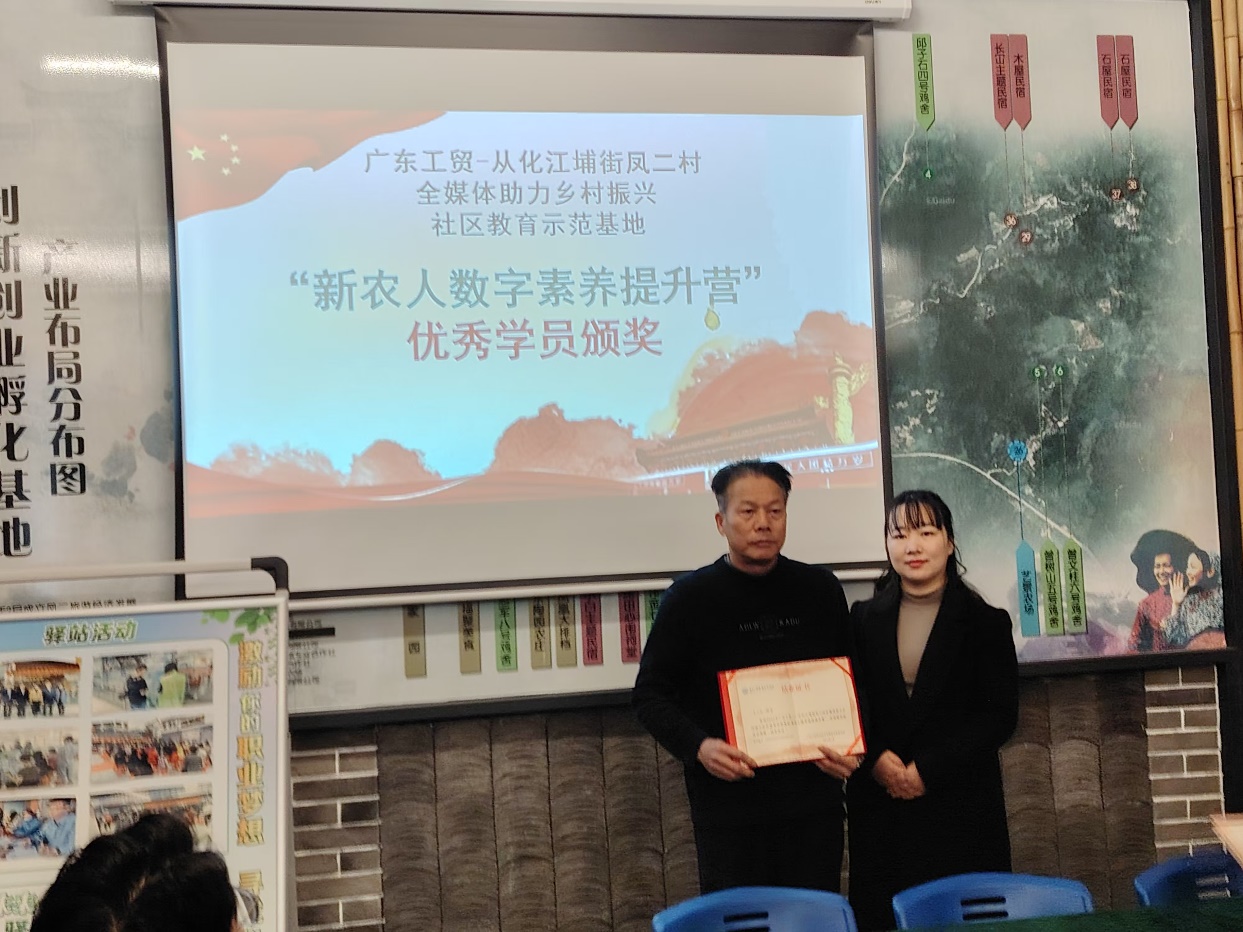 此次“新农人数字素养提升营”的顺利结业,标志着广东工贸-从化江埔街凤二村省级全媒体助力乡村振兴社区教育示范基地又迈出了坚实的一步。未来,项目团队将继续发挥专业优势,与凤二村保持紧密合作,共同推动乡村数字化转型,同时也将不断总结经验,创新培训模式,为更多乡村培养出具备数字素养的新农人,助力乡村振兴!