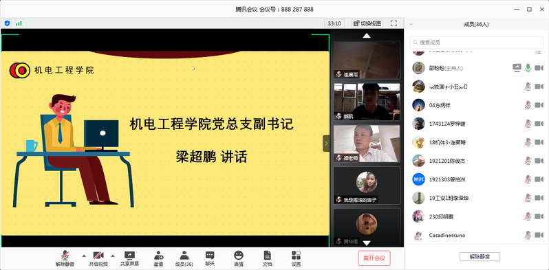 在疫情防控期间,为了加强对参加技能比赛和互联网+比赛的43位在校生的管理,保障学生的在校安全。机电工程学院于525日召开线上在校生安全教育会议。参与会议的有机电工程学院党总支副书记梁超鹏,学工办主任严惠琴,辅导员邵盼盼,吴文婷老师。