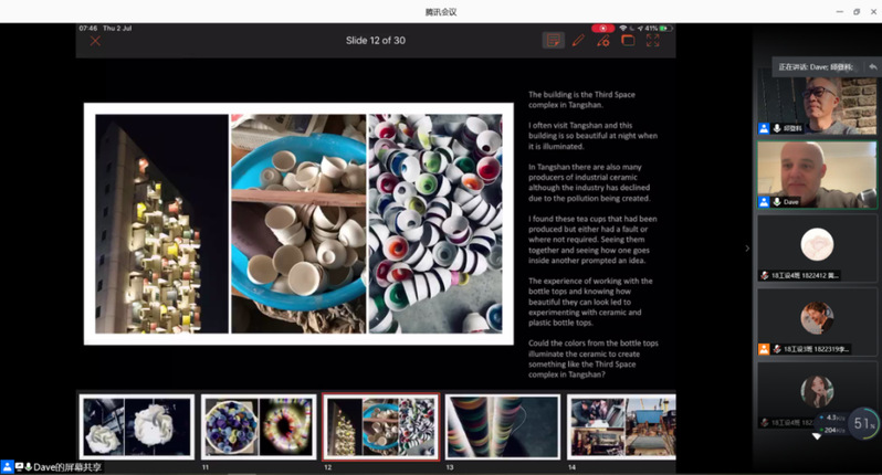 此次工作坊实践教学活动,是在疫情的特殊时期举行了的一场跨越时空的材料、设计与艺术的碰撞,国外导师、协会专家、校内教师的密切协同配合,同学门的热情参与,给我们彼此提供了艺术和思想的盛宴。其丰富了线上教学的活动形式、拓展了师生的学术国际视野,同时将“中英废弃物再利用绿色工业设计的研究与实践”项目合作深入推进。