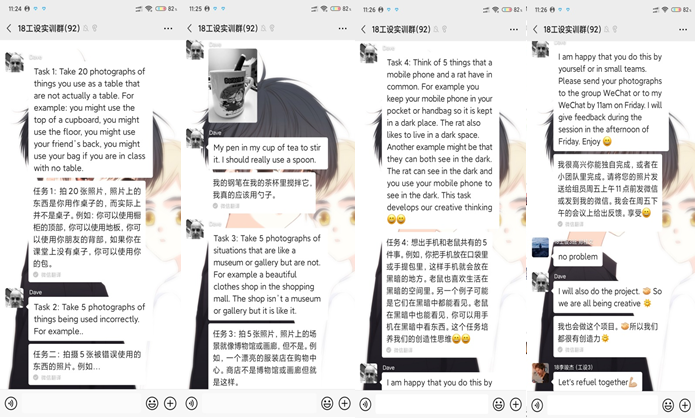 由于英国时差David Bramston教授和邱登科教授教学时间安排为下午14:30-17:00是直播教学,晚上18:00-21:00为微信平台小组互动答疑和作业评讲时间,上午8:30-11:30为校内教师协助落实学生的设计实践任务。