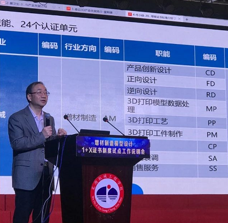 3、增材制造模型设计1+X培训与考务安排,分别由北京市自动化工程学校培训学校李斌校长做了《增材制造模型设计职业技能等级证书培训大纲与工作介绍》报告、北京赛育达科教有限责任公司“1+X”专家陈玲芝做了《证书考核、考务安排及相关事项说明》报告。