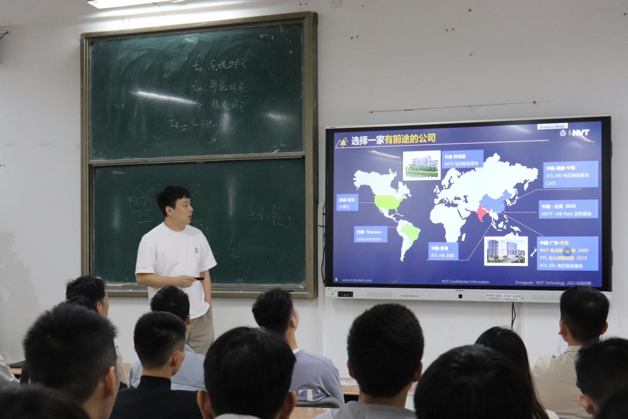会上,东莞新能德科技有限公司的徐经理通过播放宣传片和PPT展示的方式向同学们详细讲解了公司简介、业务简介、招聘岗位、薪酬福利、职业发展前景以及人员需求。在互动环节,同学们就自己对企业感兴趣的方面进行了提问,徐经理对同学们的提问进行一一解答。