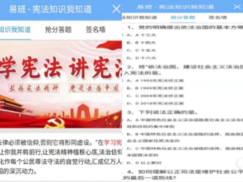 机电工程学院易班工作站开展线上活动,利用易班APP平台创建轻应用进行宪法知识竞赛答题活动,活动以随机出相关宪法问题的形式,让同学们在答题过程中学习到相关宪法的知识内容,同时开设签名墙板块供同学们留言评论。我院开展此线上活动,在于宣扬“法律必须被信仰,否则它将形同虚设”。在学习宪法的路上,让宪法精神植根心底,法治信仰蓬勃生长,化作每个公民尊法守法的自觉行动,汇成亿万人民依法治国的深沉动力。