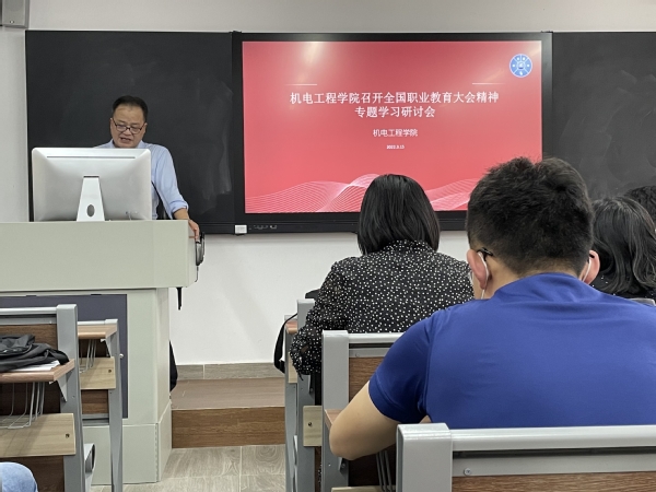 为学习贯彻习近平总书记关于职业教育的重要指示精神和全国职业教育大会精神,推动我院职业教育高质量发展,机电工程学院于315日下午两点在天河校区东区204室召开专题学习研讨会。机电工程学院全体教职工参加会议,会议由机电工程学院党总支书记邵超城主持。