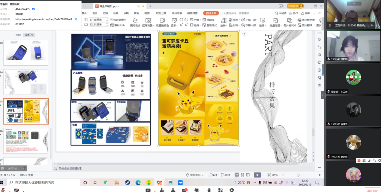 毕业设计是教学工作的重要组成部分,是毕业前对学生综合性实践能力和专业素质进行全面考核的一个必要环节。为应对疫情对教学造成的影响,保障2022届毕业设计工作顺利开展,5月14日,机电工程学院工业设计系在线上开展了2022届毕业设计答辩工作。