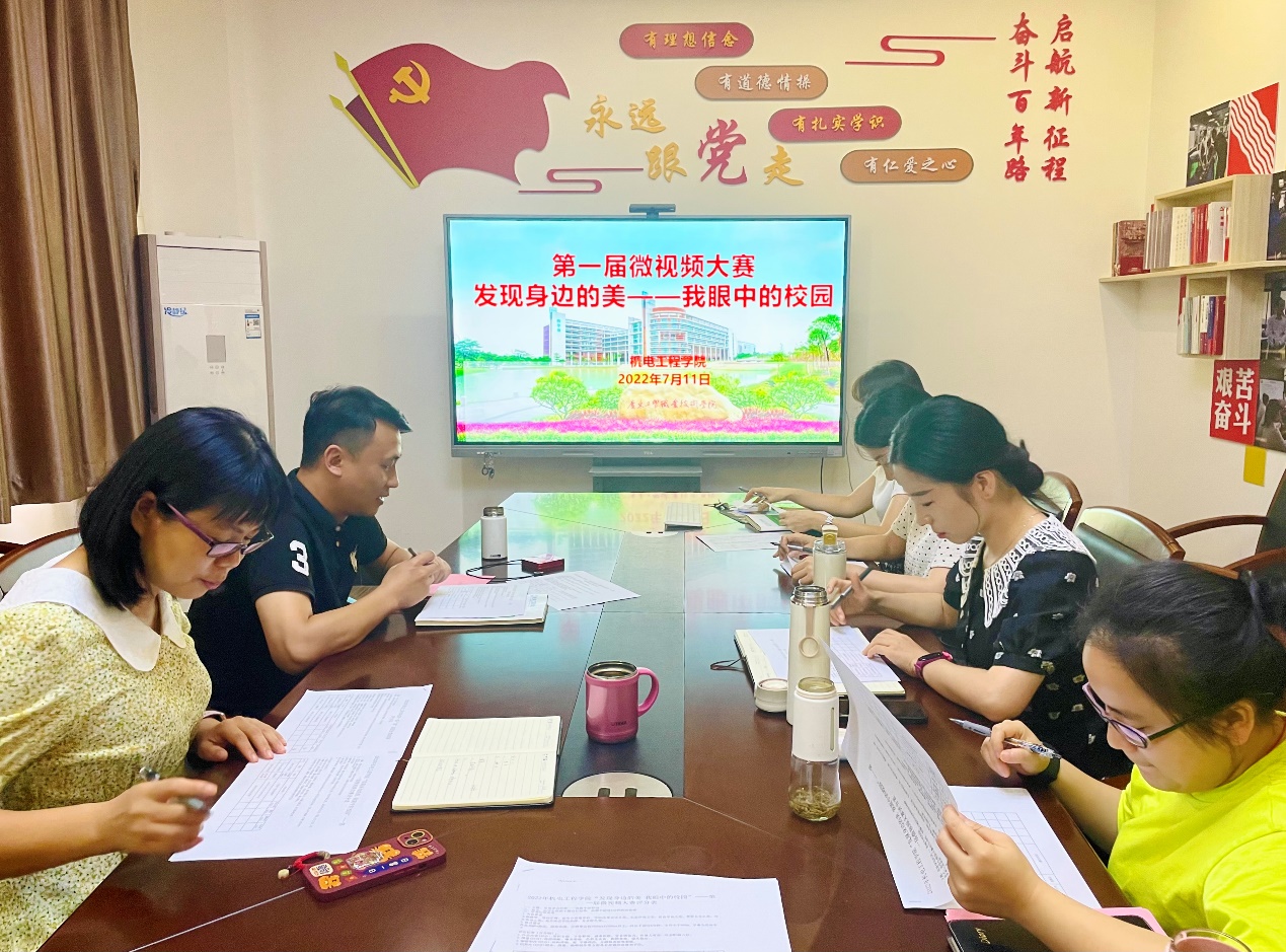 为了喜迎二十大的胜利召开和庆祝中国共产主义青年团成立100周年,培养学生爱校荣校,积极参与建设和谐美丽的校园环境,激发他们去发现和挖掘身边的美丽风景,捕捉校园美好生活中一幕幕精彩的瞬间,一个个开心的时刻,一幅幅生动的画面。机电工程学院组织举办 “发现身边的美 我眼中的校园”——第一届微视频大赛。7月11日下午在明德楼1—217举行评审大会,本次比赛由机电工程学院党总支副书记梁超鹏、学工办主任严惠琴及各辅导员担任评委。