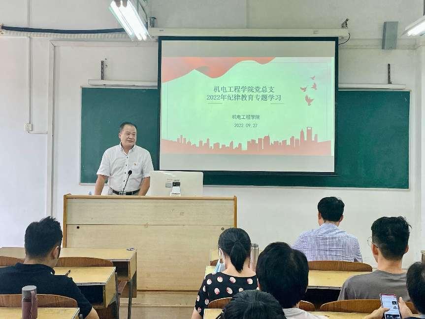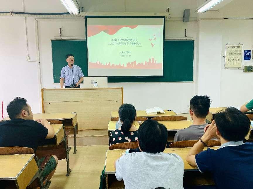 为深入学习领会习近平总书记关于党的自我革命战略思想,发扬彻底的自我革命精神,增强拒腐防变和抵御风险能力。机电工程学院党总支在纪律教育学习月持续开展教育学习活动,并于9月27日在天河校区西区综合楼501室召开学习会议。机电工程学院全体党员参加会议,会议由机电工程学院党总支书记邵超城主持。