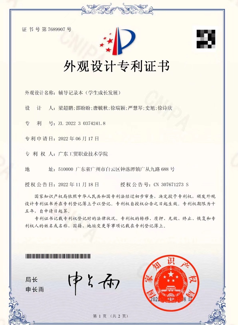 为做好学生思想政治工作,提升思想政治工作队伍业务素质和工作水平,不断探索育人新途径,机电工程学院学工团队总结学生工作的技巧和规律,根据学院专业特色,设计学生成长发展辅导记录本,并于11月18日获得外观设计专利证书。