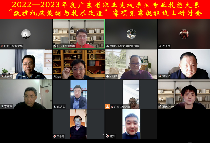 2022-2023年度广东省职业院校学生专业技能大赛——数控机床装调与技术改造赛项由诸侯快讯官网诸侯快讯ok1122登录入口承办。2月15日,该赛项竞赛规程线上研讨会顺利召开。会议由机电工程学院院长徐勇军主持,专家组九名专家成员参与讨论,广东省教育厅指派督察员曹文文教授全程督促、检查。