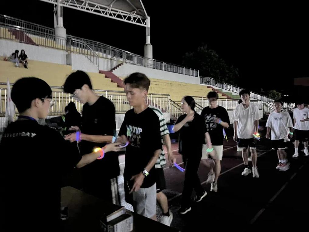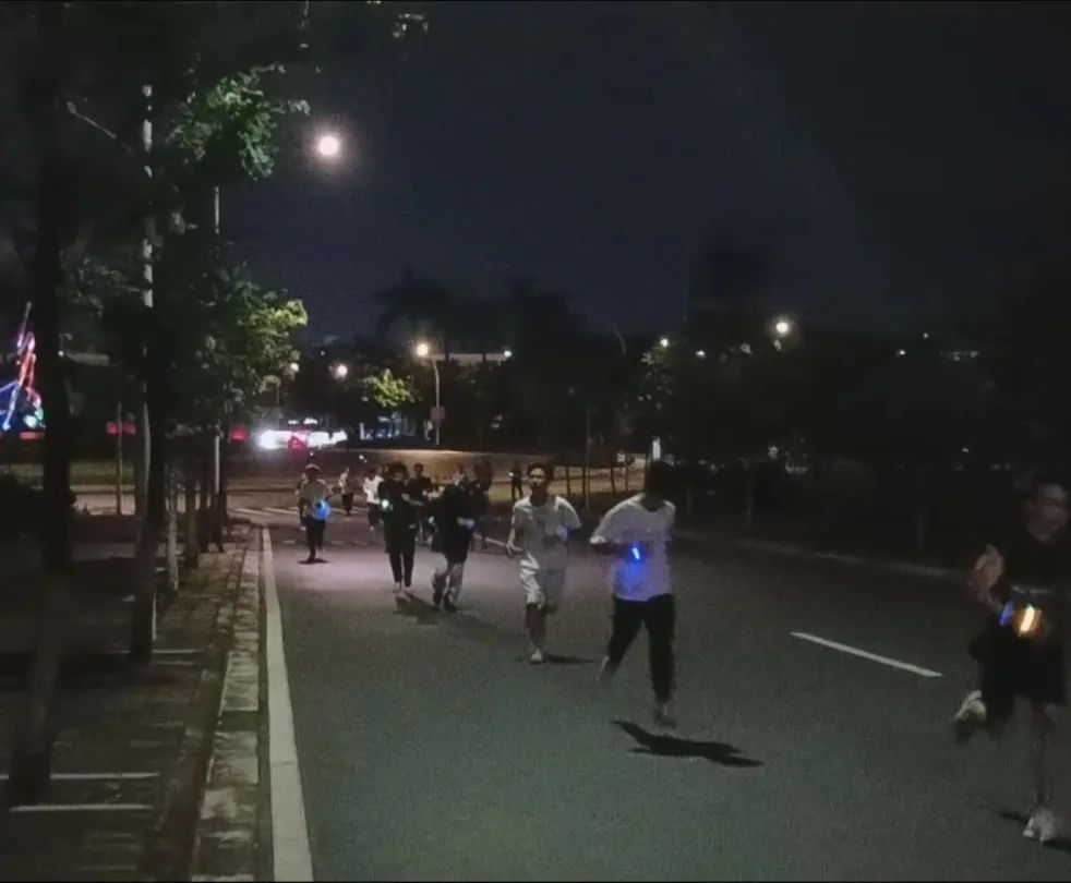 在路灯的余辉下,参赛者在校园内穿梭,荧光手环随着摆臂在手中摇晃着,远看犹如一颗颗五彩斑斓的光点,汇聚成一条炫彩夺目、快速流动的河流。工作人员挥舞着党旗及院旗,为参赛成员加油助威,并在相应打卡点为其加油打气,参赛者激情澎湃,全力奔向终点。