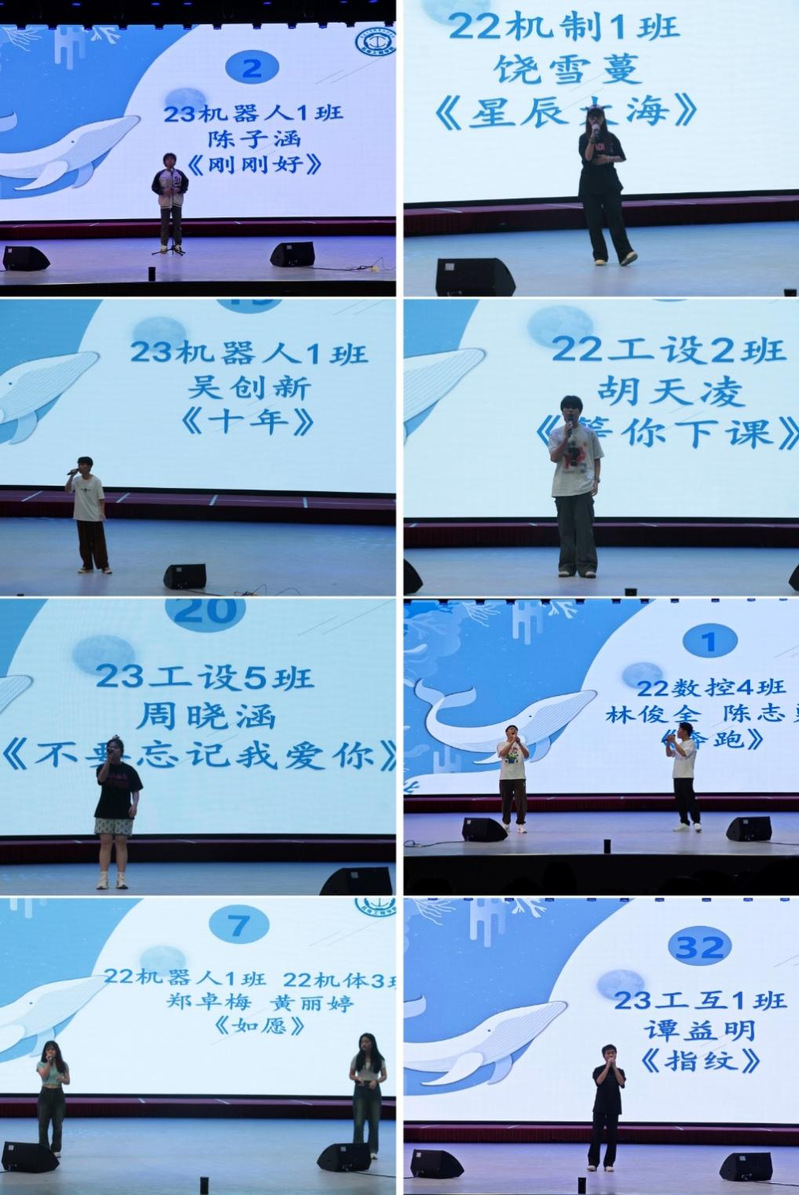 比赛过程中,选手们用心演唱,观众们沉浸聆听,动情歌声与动人情感糅杂在一起,阐释的不仅是比赛的主题,也是生命的命题。每一场演唱的尾声,现场都掌声雷动,扣人心弦的歌声与歌词皆余音绕梁,久久不绝。22数控4班林俊全、陈志勇组合演唱《奔跑》,用动感的旋律和励志的歌词,传递出向前奔跑的勇气和决心;23机器人1班吴创新带来了不一样的《十年》,前半段用粤语演唱,传达出要珍惜当下,珍惜时间,珍惜眼前人,动听的旋律萦绕着整个会场;23工设4班裴俊健带来的《天后》,聆听时,仿佛能感受到那种坚持与蜕变的力量。歌词中透露出面对困难时,我们应有天后般的勇气与自信;23工设5班伍雅雯带来的《我的歌声里》旋律动人,听后让人感受到无尽的希望和力量,仿佛有一种无形的力量在推动着自己前行。22机器人1班郑卓梅和22机体3班黄丽婷组合演唱的《如愿》这首歌曲展现了劳动人民的努力奋斗,传达了对老一辈人的感激之情,同时也激励了现实生活中的人们。