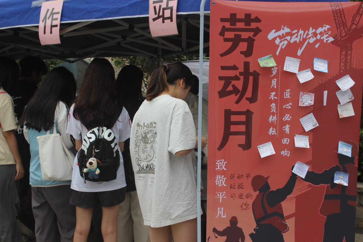 活动前期工作人员提前布置好场地,并准备好活动的相关物品,积极引导学生参加活动。此次活动分为三个部分,分别为劳剪艺心、劳心敬语、光盘行动。劳剪艺心环节,同学们拿出工具折剪出规定的图案,来提高学生的动手能力;劳心敬语环节,同学在便签纸上写下诗歌、词句等表达对劳动楷模的敬仰之情;光盘行动环节,同学们通过在食堂支付后进行光盘行动的打卡,进行拍照上传领取爱心餐公益基金并捐赠。活动现场人头攒动、气氛活跃,同学们积极互动、兴致盎然。