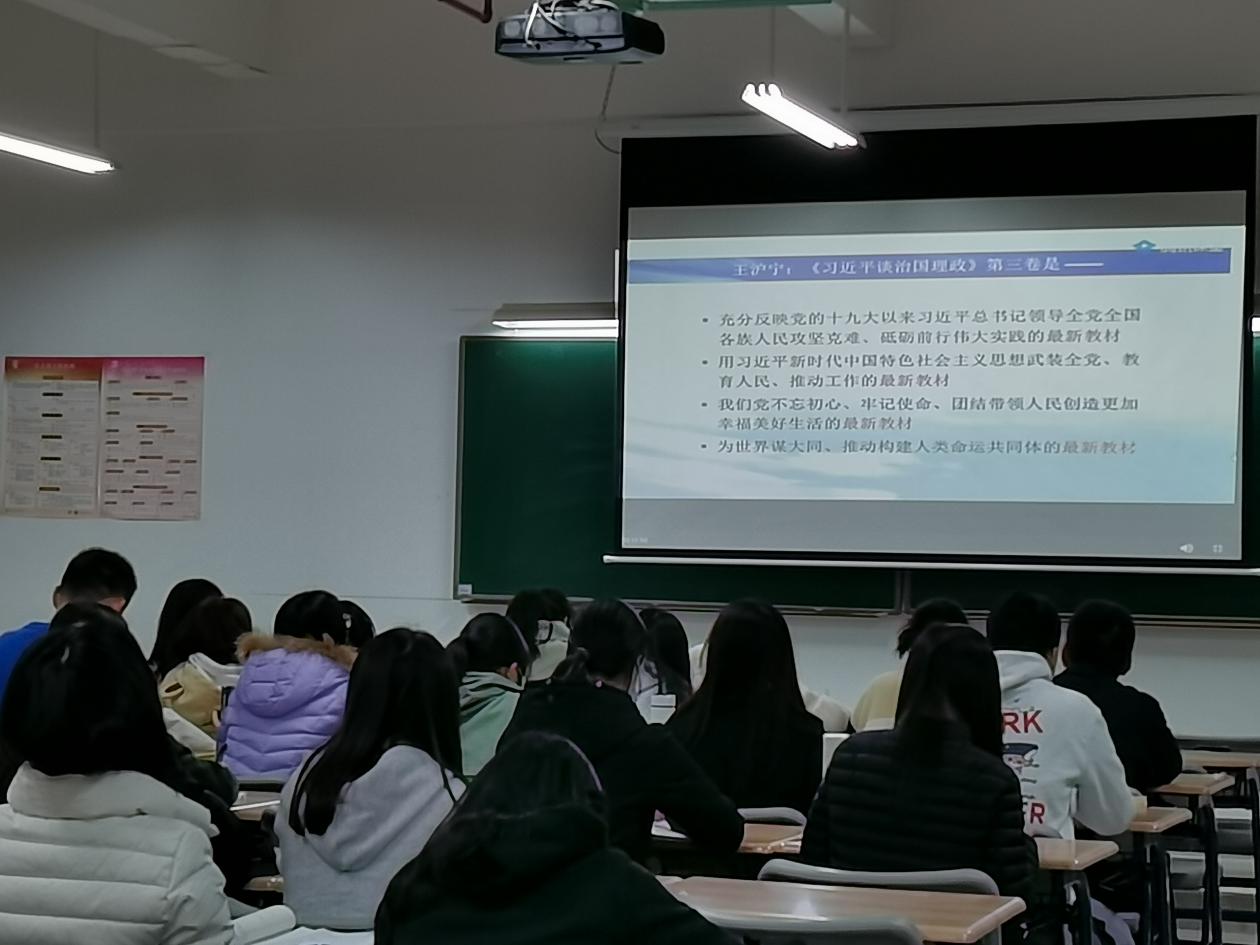 丁妙珍在课上带领同学们回顾了习近平总书记的五四运动100周年大会的讲话的内容,并从学习贯彻《习近平谈治国理政》、青年为什么要培育和践行社会主义核心价值观、培育和践行社会主义核心价值观的背景、社会主义核心价值观的内涵以及如何践行社会主义核心价值观等五大方面与同学们进行深入的交流与分享。