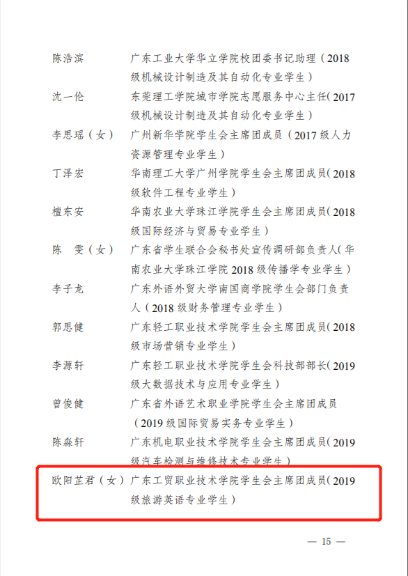4月26日,在广东省学生联合会组织的“评选表彰2020—2021年度广东省优秀学生骨干”的活动中,我校学生欧阳芷君获评 “广东省优秀学生骨干”、 “广东省优秀共青团员”荣誉称号。