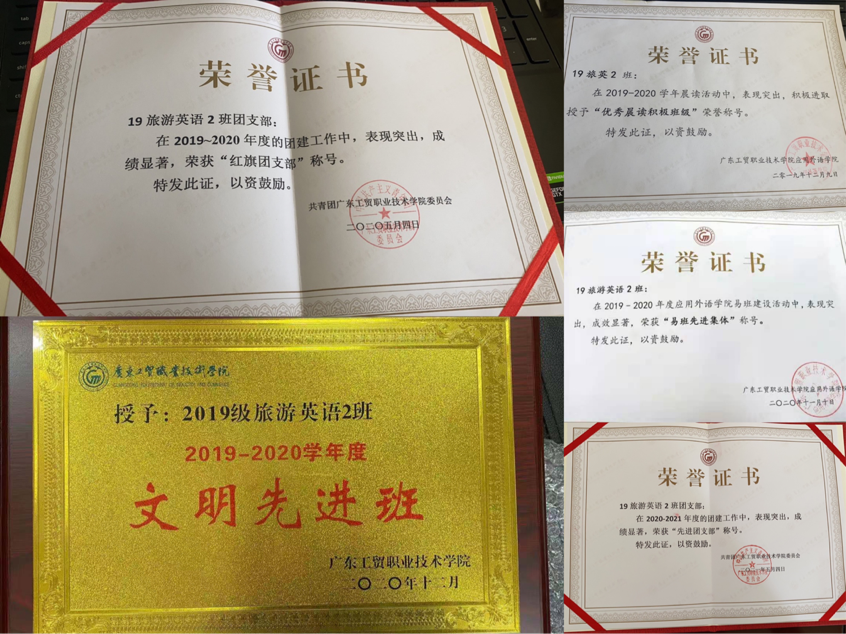19旅游英语2班团支部成员有着强烈的集体责任感,以实际行动为班级争取优异成绩。一间宿舍获评学校年度“文明宿舍”,我支部获第十八届“百歌颂中华,校园合唱节”网络人气奖;在晨读活动中荣获2018-2019学年“晨读积极班级”;荣获2019-2020年度“易班先进集体”称号;被评为2019-2020年度“红旗团支部”;2019-2020年度“文明先进班”称号;第十九届“百歌颂中华,校园合唱节”二等奖;2020-2021年度“先进团支部”。