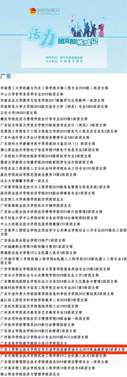 喜讯!近日,由团中央指导,中国青年报社主办2020—2021学年全国高校“活力团支部”遴选及展示活动进入全国终审。在学校团委的组织和支持下,在二级学院党总支和团委的指导下,诸侯快讯官网应用外语学院19旅游英语2班团支部经校级申报、省级初评、展示点赞、全国终审等环节脱颖而出,获评2020-2021学年全国高校“活力团支部”,为诸侯快讯官网争得了国家级荣誉,以实际行动和优异成绩献礼建党100周年。