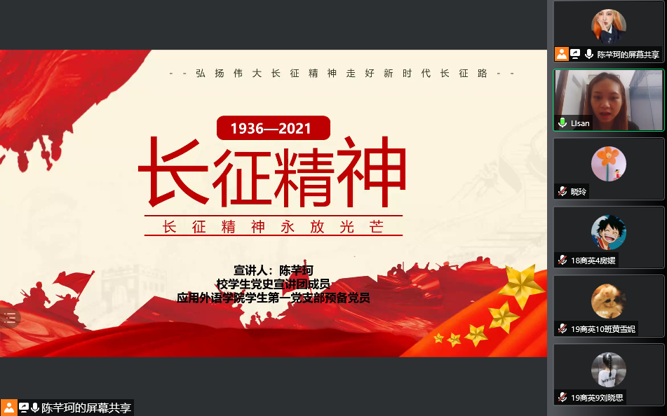 百年党史,波澜壮阔;百年大党,风华正茂。为了加强对青年大学生党史的学习教育,传承红色基因,校学生党史宣讲团成员、应用外语学院学生第一党支部预备党员陈芊珂,于8月20日晚7点半和22日晚,分别给20商英10班团支部和应用外语学院学生第一党支部开展了线上党史专题宣讲,上了一堂以“长征精神”为题的党史课。应用外语学院学生第一党支部书记陈晓玲、20商英10班团支部、学院学生第一党支部全体成员认真聆听了党课,并进行了交流。