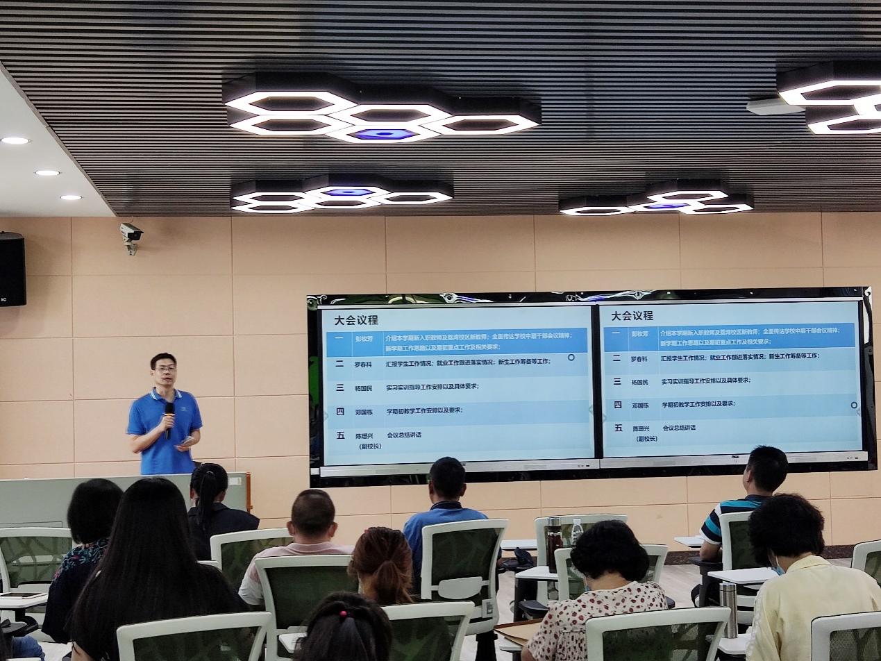 罗春科汇报学院学生总体情况、2021届毕业生就业情况、学工团队近年获奖情况以及开学初班主任工作安排等;杨国民从毕业生顶岗实习工作对指导老师提出要求,务必保证顶岗实习学生顺利到岗实习,关心关注同学生的工作问题和身心健康;邓国栋就学期初教学管理工作提出要求,为教学工作顺利开展作出具体安排;
