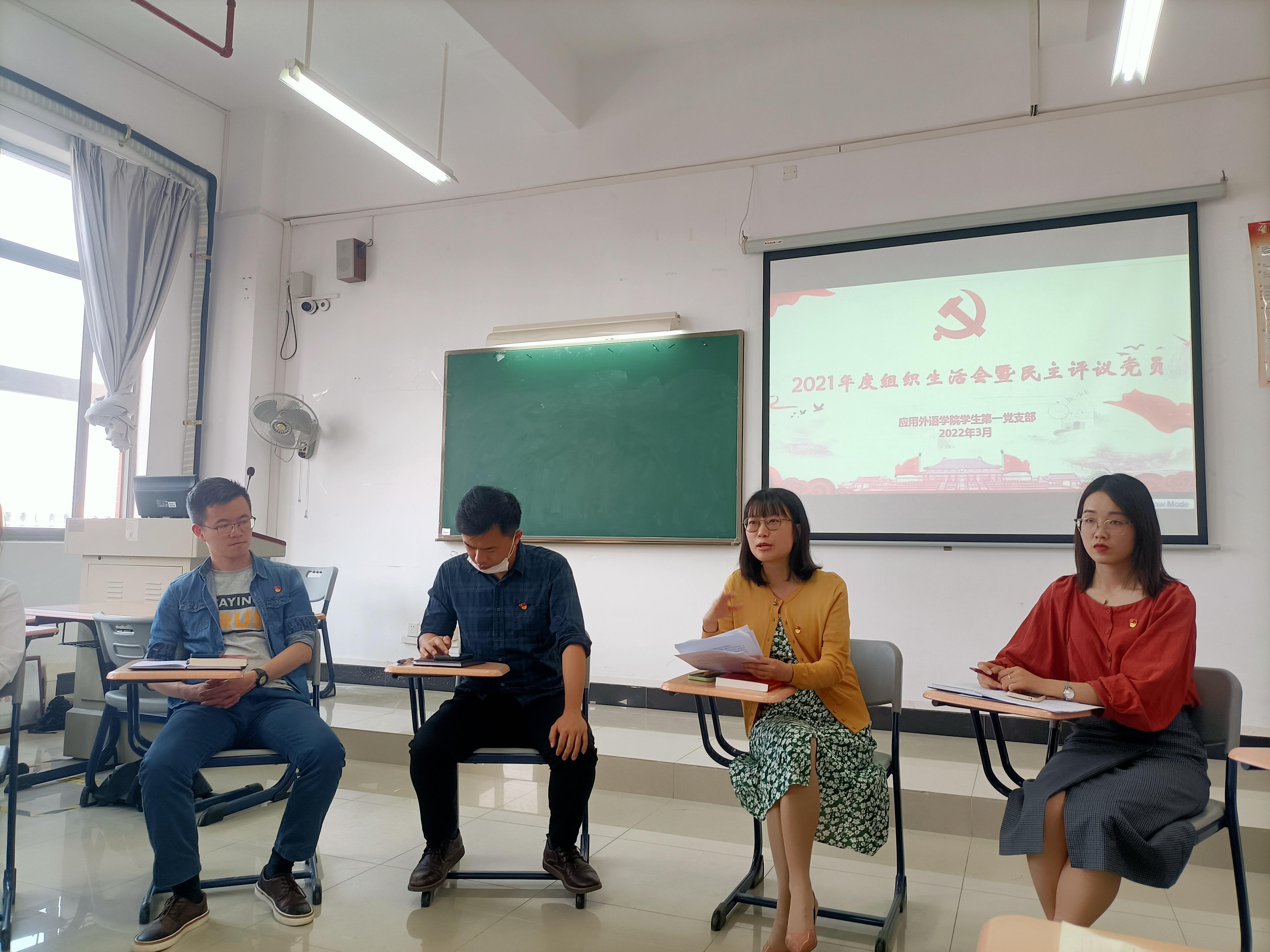 为深入学习贯彻党的十九届六中全会精神,不断推进党的建设新的伟大工程,根据学校党委有关工作部署要求,应用外语学院学生第一党支部于3月15日下午2点在明德楼1-618党员活动室召开了2021年度组织生活会暨民主评议党员会议,支部全体党员参加了本次会议,会议由支部书记陈晓玲主持。