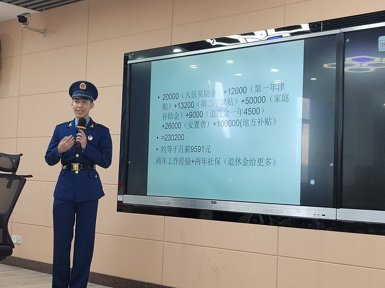 随后,退伍学生杜晓磊从思想政治、经济优待、个人成长三个方面为同学们详细讲解了征兵入伍的优待政策,为大家解答了很多的困惑,充分调动了同学们应征入伍的积极并且也为部分同学指明了方向。此次宣讲会还邀请了7名退伍学生分享他们的军旅生活,从参军经历和成长历程等方面实现人生价值,大大激发了同学们应征入伍的热情。