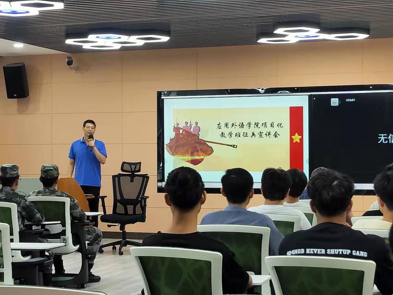 为推进新时代强军事业,充分调动学生报名应征入伍的积极性,强化学生服兵役的责任感和参军保卫祖国的意识。6月30日下午,应用外语学院于白云校区行知楼604召开项目化教学班征兵宣讲会,应用外语学院副院长邓国栋、辅导员、军协退伍军人以及2020级项目化教学班全体男生参会。