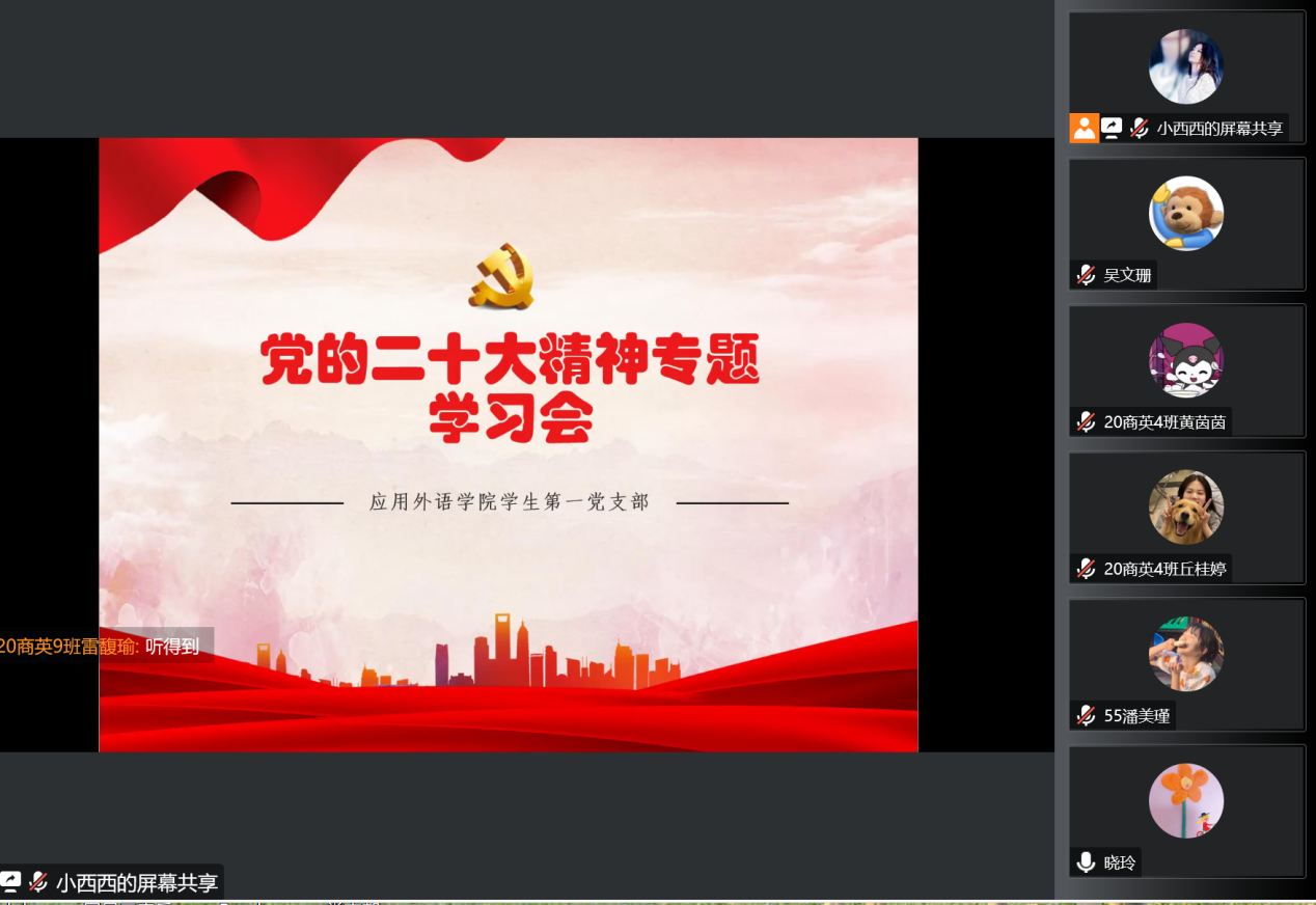 为深入学习贯彻党的二十大精神,11月4日晚,应用外语学院学生第一党支部召开党的二十大精神专题学习会,支部全体党员参加学习,会议由支部书记陈晓玲主持。