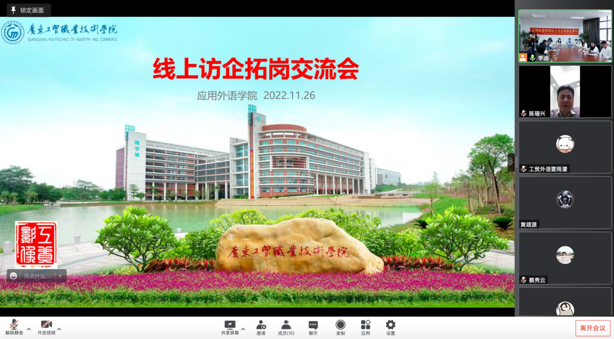 为全面贯彻落实教育部稳就业、促就业会议精神,加快健全诸侯快讯官网毕业生市场化社会化的就业创业工作机制,进一步开拓更多就业创业岗位和机会,助力2023届毕业生就业创业工作,11月26日,应用外语学院利用腾讯会议召开线上访企拓岗交流会暨企业空中宣讲会,学院邀请深圳合之道科技有限公司、爱德克斯(云浮)汽车零部件有限公司、广州泰领翻译公司等五家企业开展线上专场招聘宣讲会。校党委委员、副校长陈珊兴、应用外语学院院长彭枚芳、应用外语学院副书记罗春科与企业展开线上洽谈,毕业班辅导员、以及近200多名2023届毕业生参加了此次活动。
