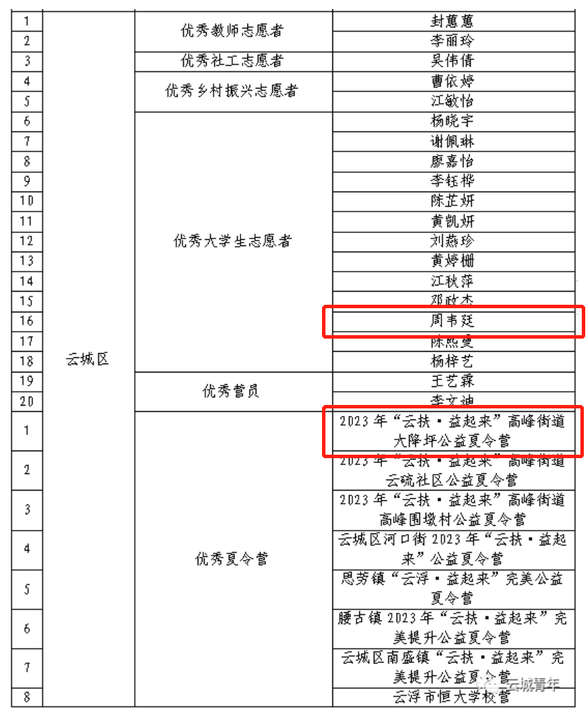 云浮市云城区高峰街夏令营优秀志愿者: